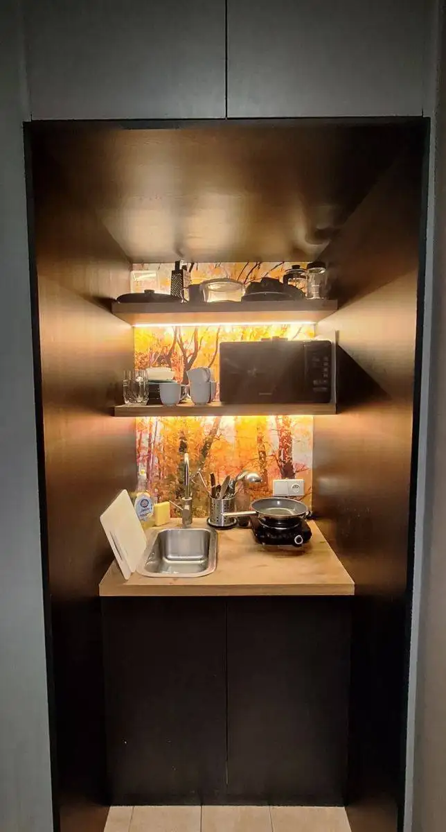 Dispozice bytu je řešena prakticky: kuchyňská část je propojená s obytnou zónou, což vytváří vzdušný a funkční hlavní prostor. Součástí bytu je koupelna a WC v jednom celku. Tento typ uspořádání je vhodný pro každodenní život i pro efektivní využití každého metru čtverečního.