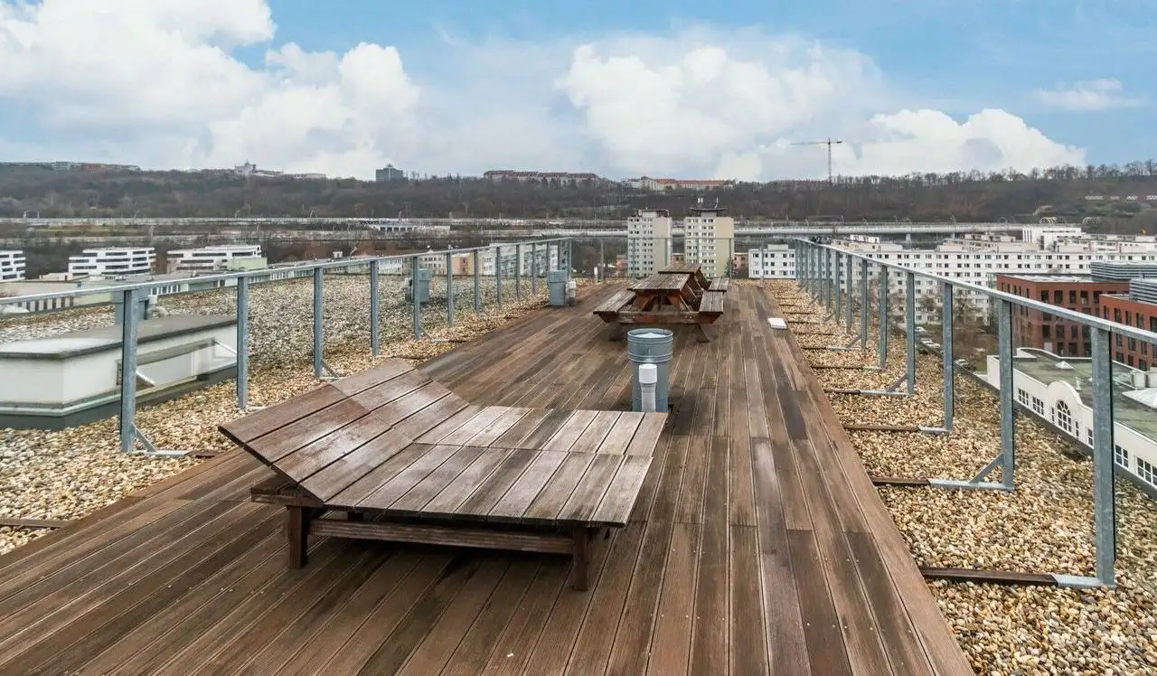 Byt se nabízí kompletně zařízený a připravený k bydlení. K dispozici je vestavěná kuchyňská linka, kompletní nábytek a prostorná vestavěná skříň. Dále je v rámci patra k dispozici skladovací komora o přibližné velikosti 1 m². V budově jsou rovněž dostupné společné prostory pro komfortní každodenní fungování: střešní terasa s relaxační zónou, fitness místnost, prádelna a také místnost pro kola.