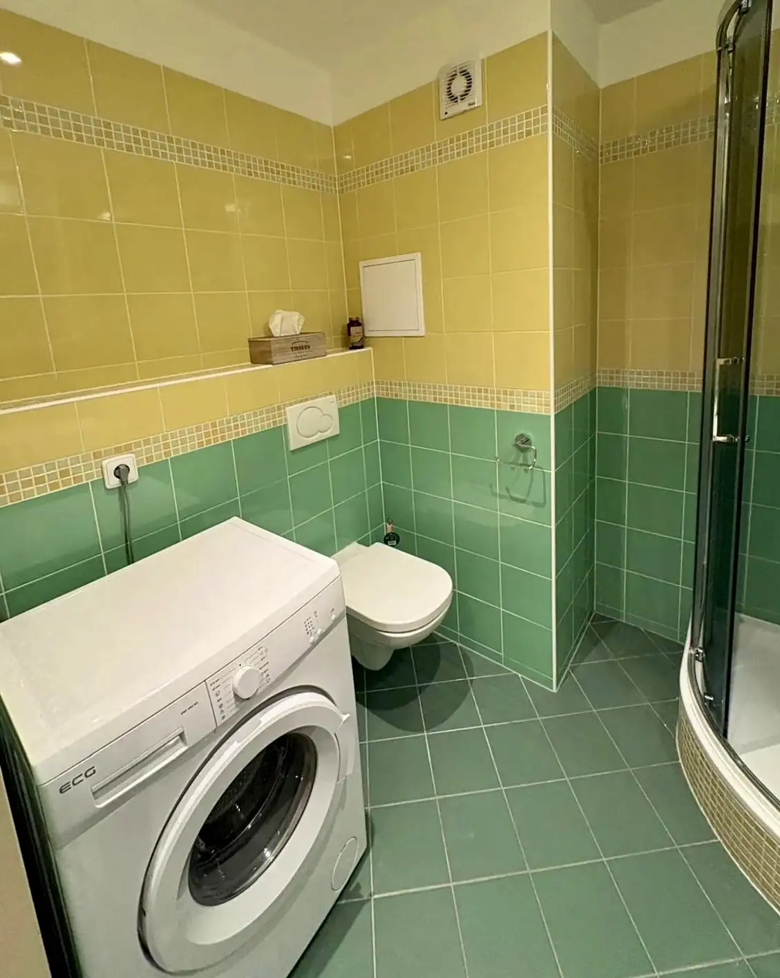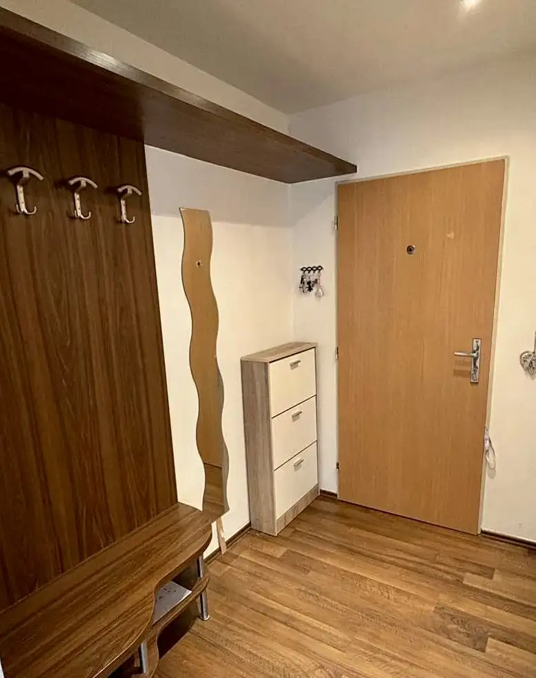 Byt je částečně zařízený, což zahrnuje moderní kuchyňskou linku s vestavěnými spotřebiči, jako je myčka na nádobí, trouba a mikrovlnná trouba. V koupelně se nachází vana a toaleta. K dispozici je také vestavěná skříň a komora, která poskytuje dostatek úložného prostoru.