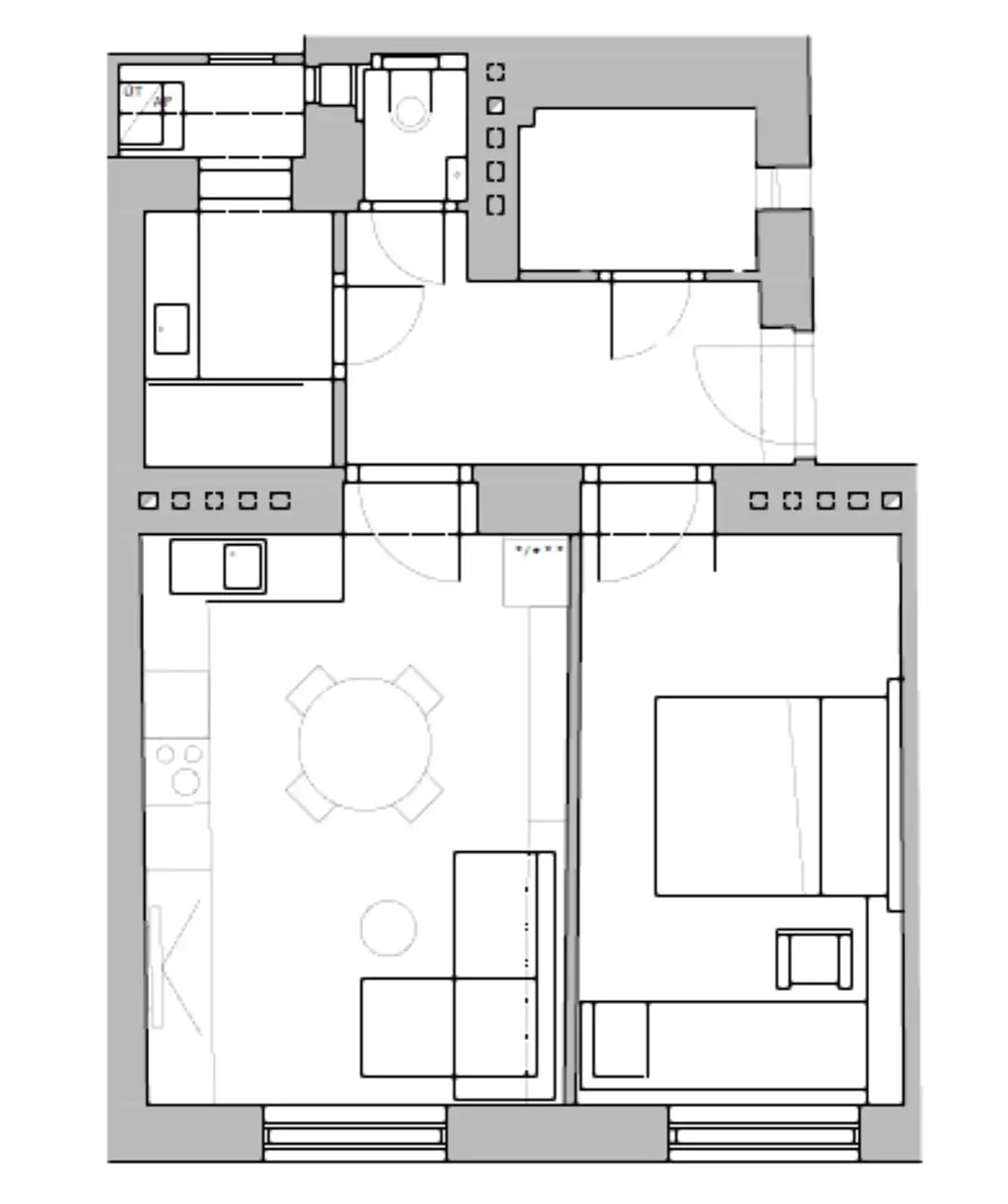 Dispozice bytu zahrnuje obývací pokoj spojený s kuchyňským koutem, ložnici a koupelnu. Okna bytu směřují na klidnou ulici, což zajišťuje dostatek přirozeného světla a klidné prostředí. Prostor je dobře rozvržený, což umožňuje pohodlné bydlení.