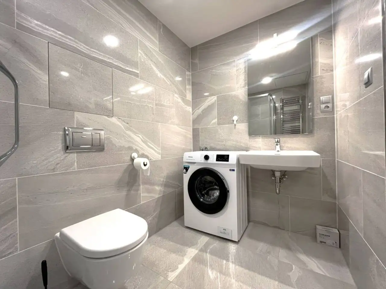 Koupelna je prakticky řešena se sprchovým koutem a je propojena s WC. Součástí vybavení je pračka. Byt se pronajímá zařízený, takže se můžete nastěhovat bez zbytečných starostí. Rezidence je navíc zabezpečena kamerovým systémem, což zvyšuje pocit bezpečí a komfortu.