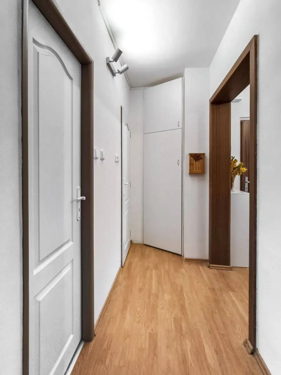 Dům je zateplený a nabízí velkou výhodu v podobě velkého výtahu, což oceníte při stěhování i v běžném každodenním používání. Byt je středový, takže je stabilnější teplotně i akusticky. Před domem je velké parkoviště a bezproblémové parkování. K dalším praktickým benefitům patří další lodžie na patře – uzamykatelná společná pro 3 byty, zasíťovaná proti holubům. Vejdou se na ni 3 rozložené sušáky na prádlo a také jízdní kola, takže získáte skutečně využitelný prostor nad rámec samotného bytu. V přízemí je také uzamykatelná společná kolárna/kočárkárna.