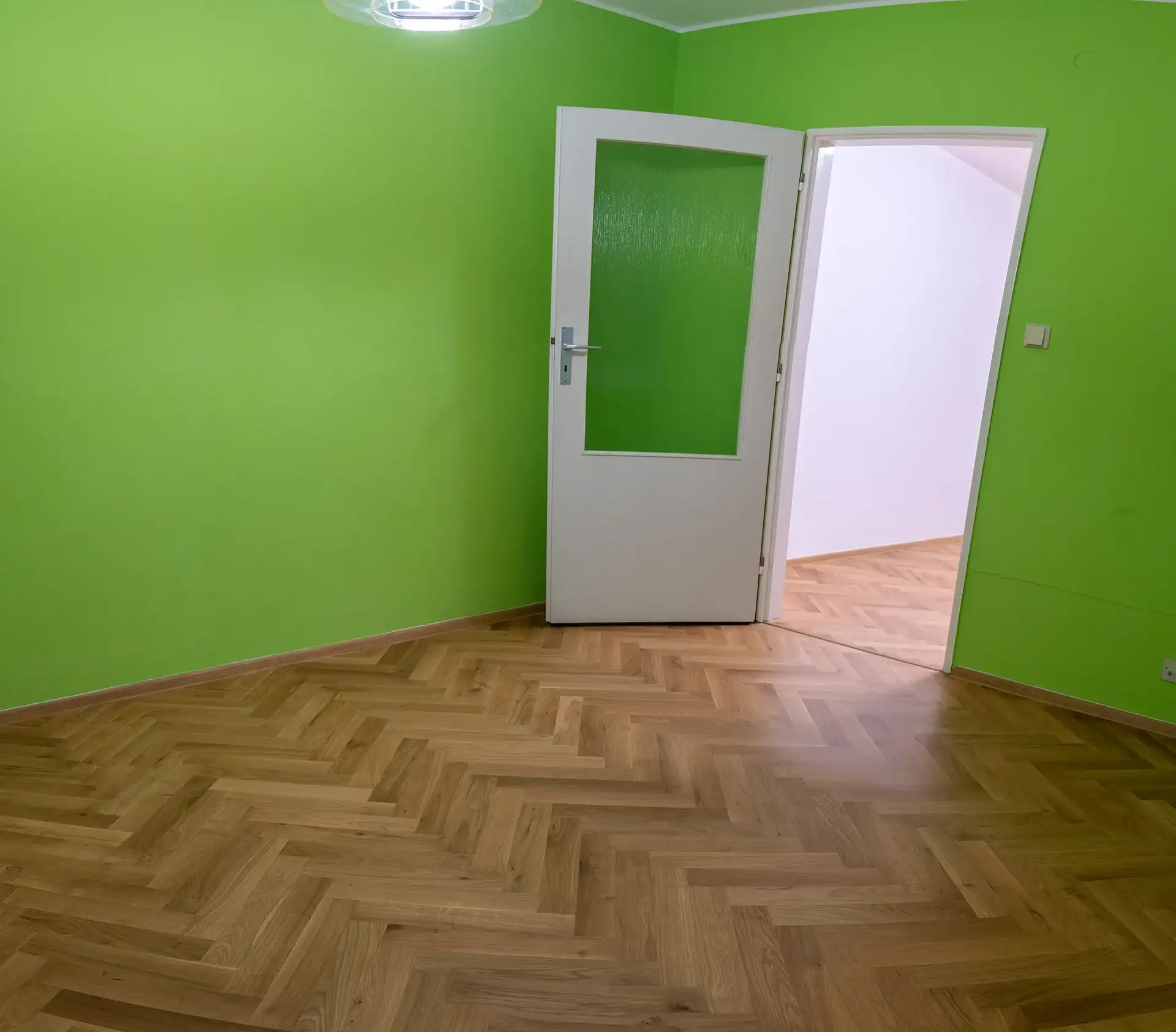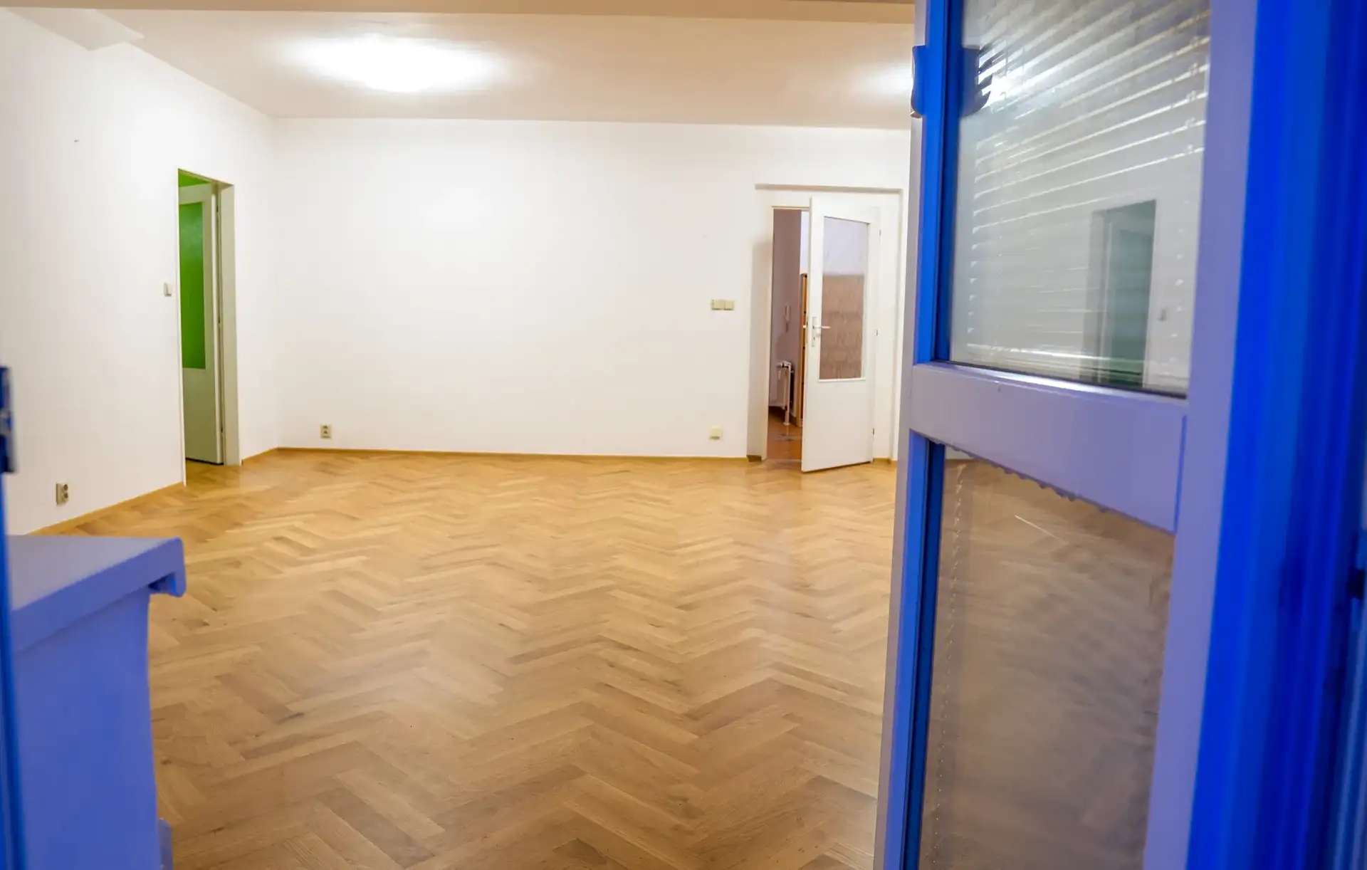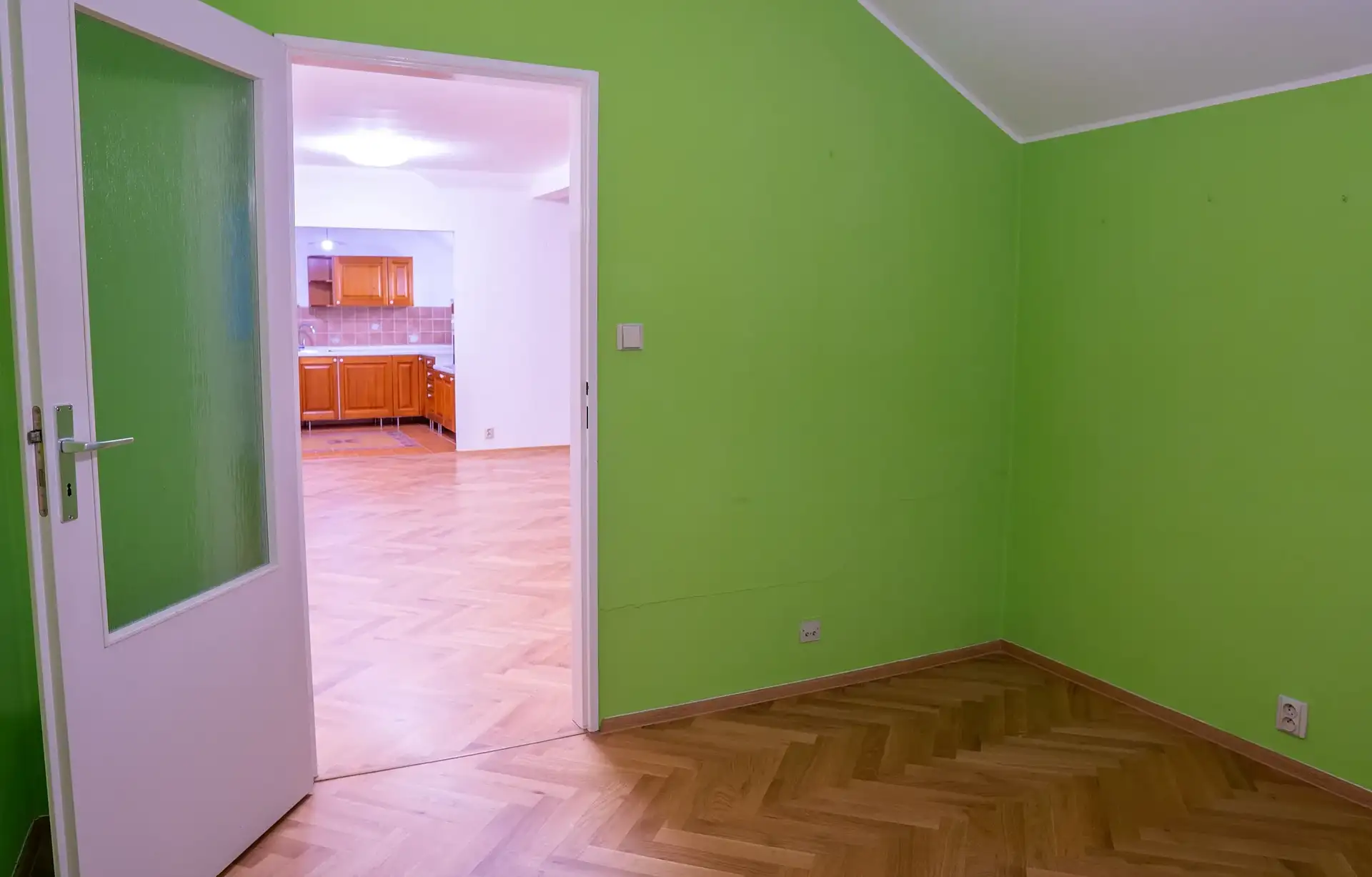 Dispozice bytu je velmi praktická: dva menší pokoje doplňuje prostorný obývací pokoj a samostatná, výrazně kapacitní kuchyně. Půdorys je navržen tak, aby jednotlivé části bytu tvořily přirozené zóny – klidová zóna pro spánek a odpočinek je oddělená od společenské části. Díky velikosti kuchyně je prostor vhodný i pro rodinné vaření nebo společné posezení.