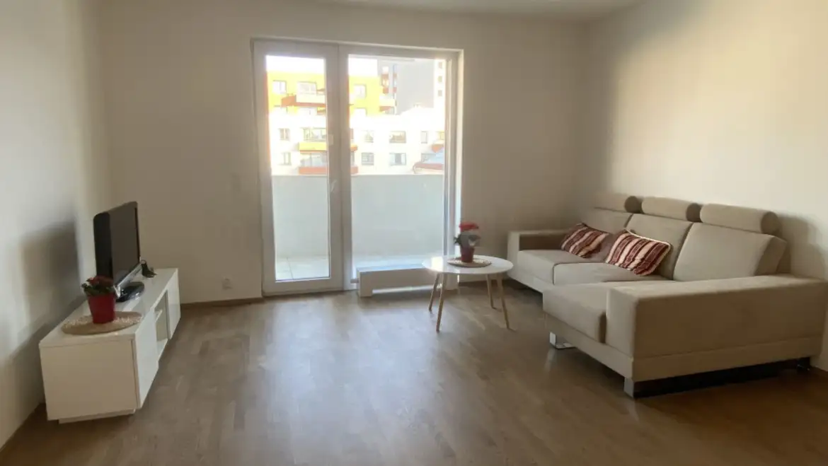 Dispozice bytu je promyšlená a nabízí příjemný rytmus dne. Dominantou je prostorný obývací pokoj propojený s kuchyňskou částí – vzniká tak vzdušný prostor vhodný pro každodenní fungování i odpočinek. Samostatná ložnice poskytuje soukromí a možnost pohodlného režimu spánku. V koupelně je vana a WC je součástí hygienického zázemí. Z předsíně se plynule vstupuje do všech místností, což zvyšuje praktičnost bydlení.