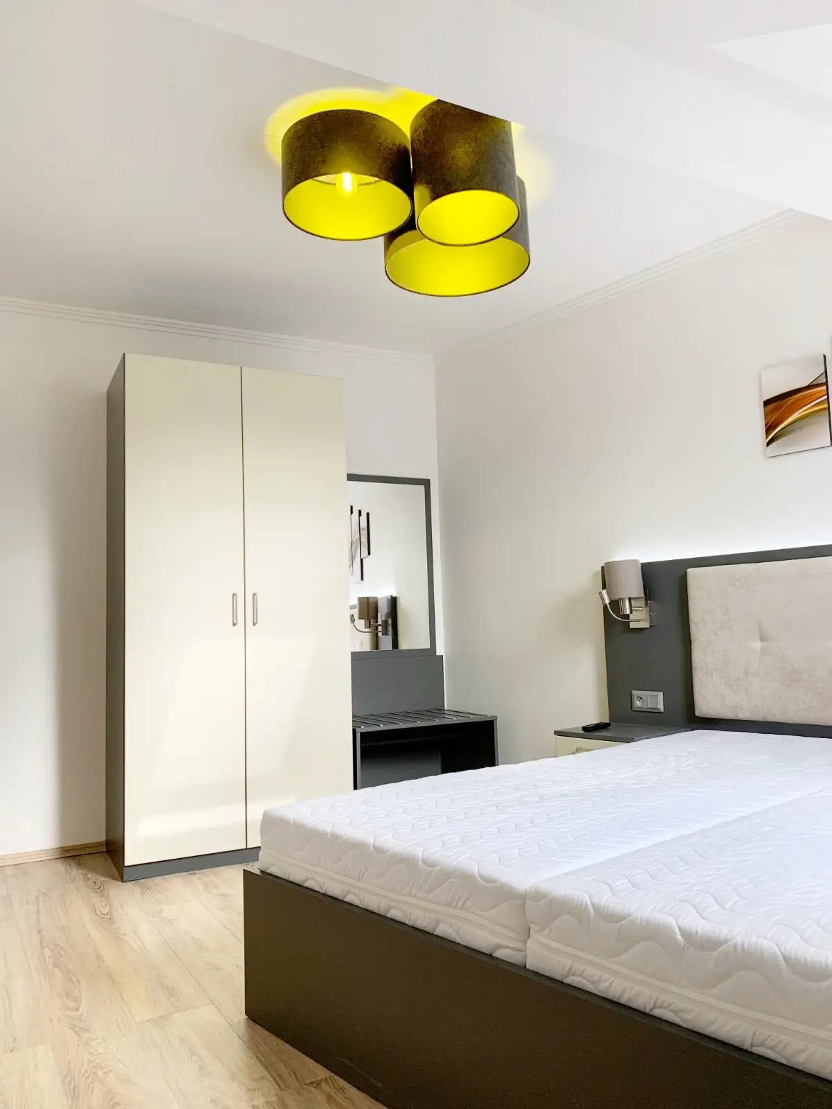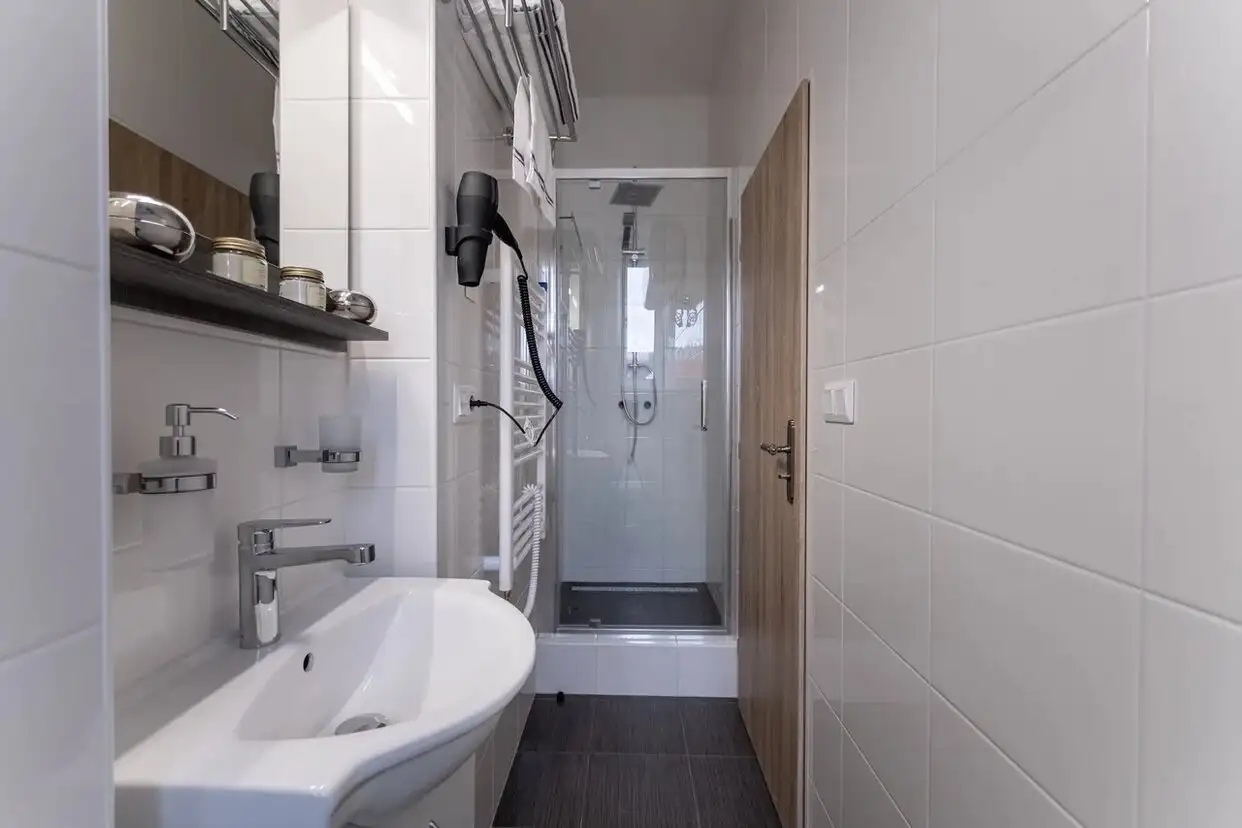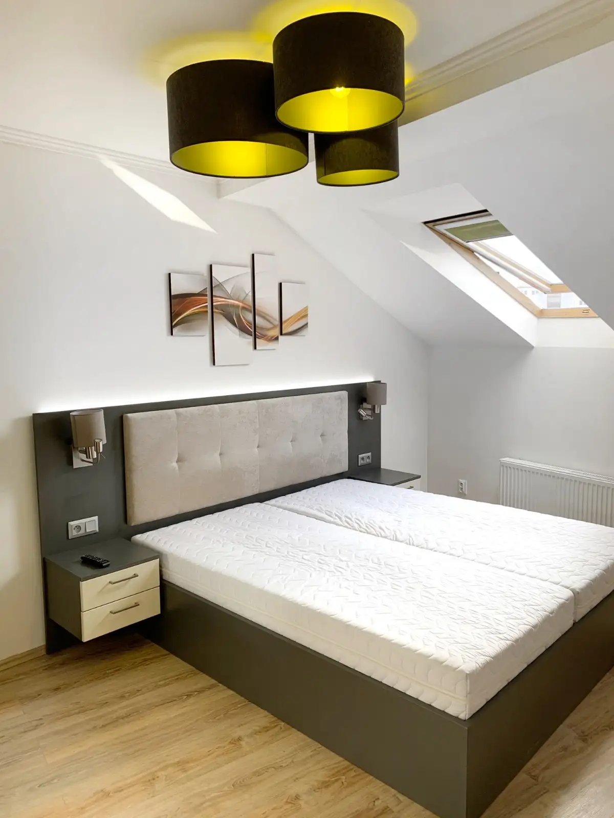 Dispozice bytu je řešena tak, že samostatná ložnice poskytuje klidovou zónu pro spánek a odpočinek. Obývací část je propojena s kuchyňským koutem, čímž vzniká příjemný prostor pro vaření, stolování i relax. K dalším místnostem patří koupelna se sprchovým vybavením a WC, dále vstupní předsíň, která pomáhá udržovat pořádek, a hlavní místnosti jsou doplněny úložnými možnostmi.