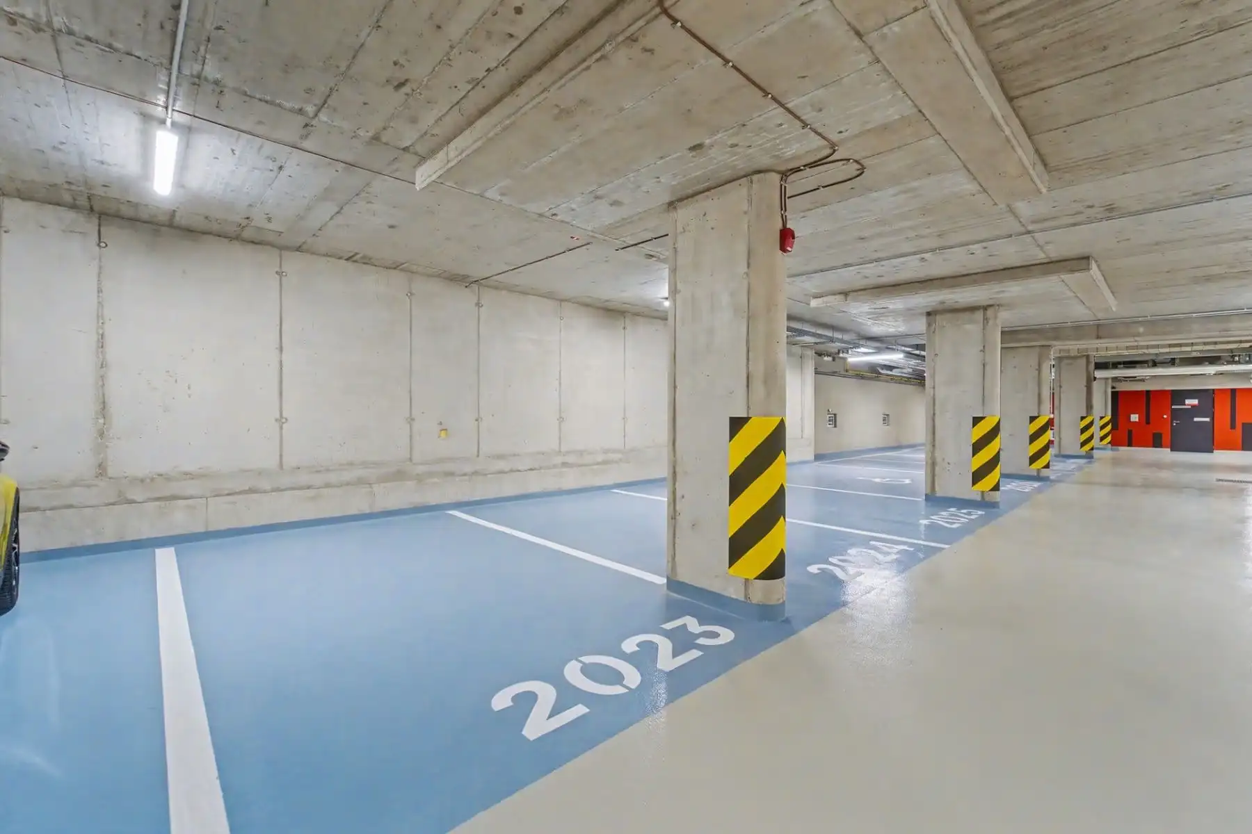 V rámci domu je zajištěn komfort přístupu – je zde výtah a bezbariérový přístup. Součástí nabídky je také možnost garážového stání (XL, 14 m²). Důležité upozornění: komora a parkovací stání se hradí samostatně – celkem 3 000 Kč. V domě je rovněž kolárna / prostor pro kola, což oceníte při každodenním dojíždění nebo pro rodiny s dětskými kočárky.